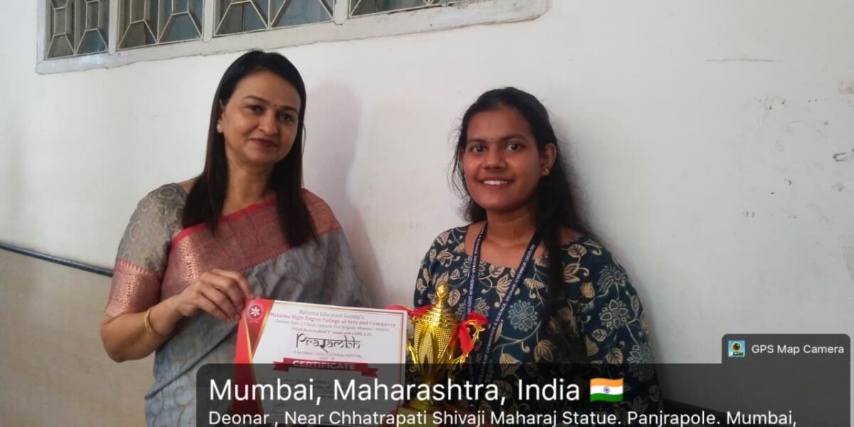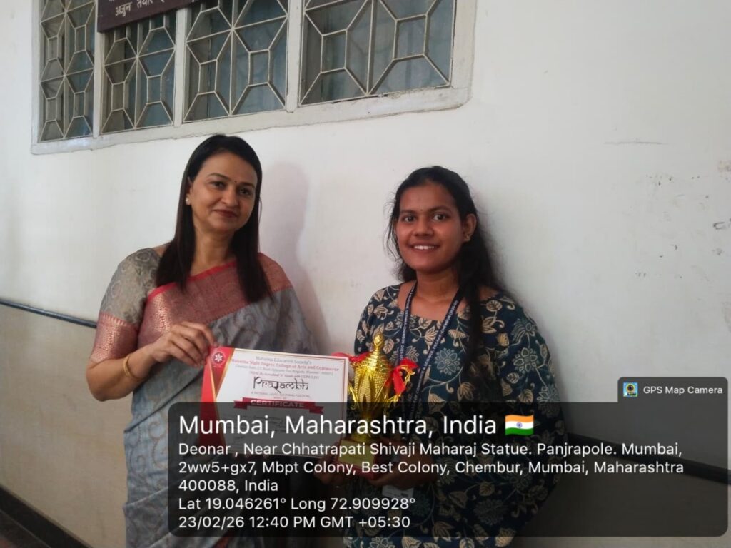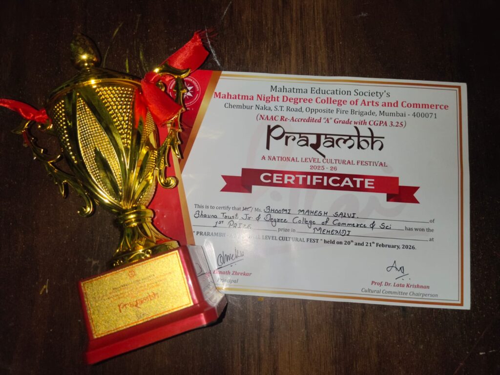 Bhoomi Salvi secured 1st Prize in the Mehndi Competition organized by Mahatma Night College. Her creative design and artistic skills were highly appreciated, bringing pride and recognition to the institution.