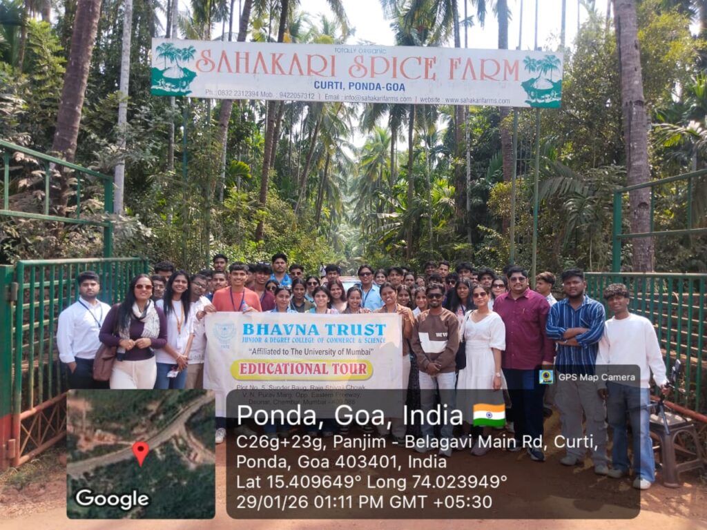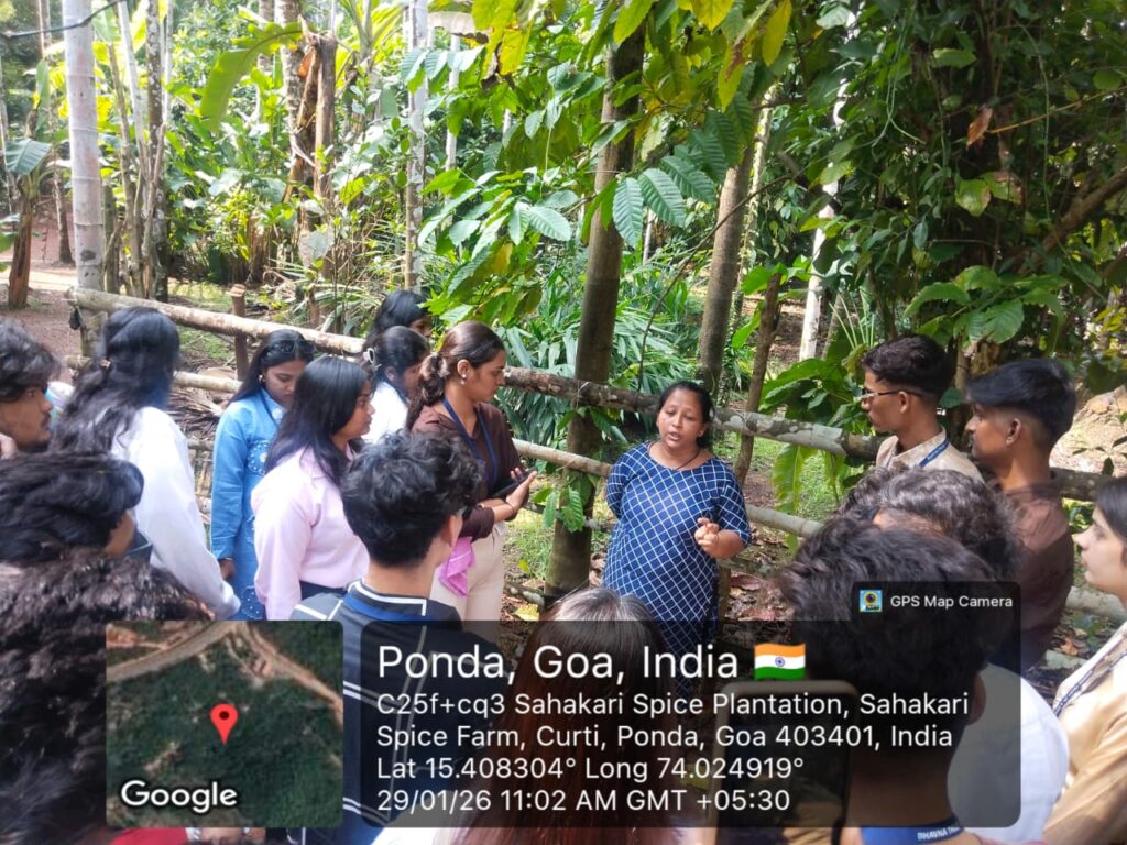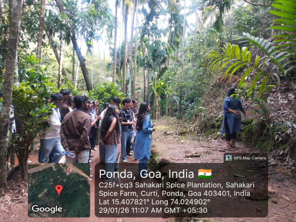 The IQAC, in association with the Educational Tour Committee, organized an educational tour to Sahakari Spice Farm, Goa, for 53 students from 27th to 31st January 2026. The visit provided practical exposure to spice cultivation, organic farming, and plantation management. Students observed various spices such as cardamom, pepper, nutmeg, vanilla, and cloves, and learned about their medicinal and commercial importance, along with traditional farming techniques and agro-tourism practices. The tour was informative and helped bridge the gap between theory and real-world learning.