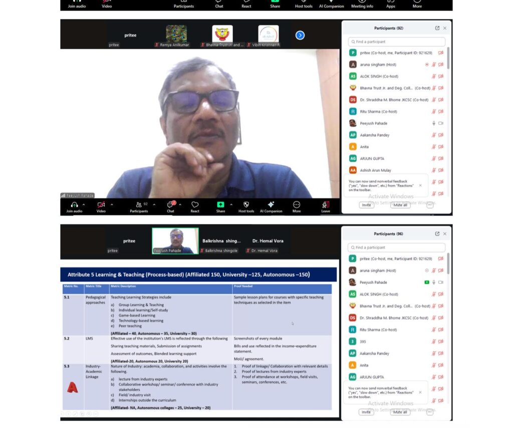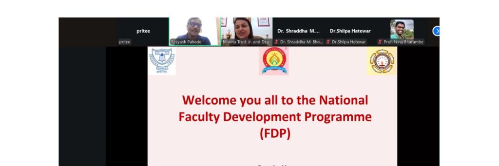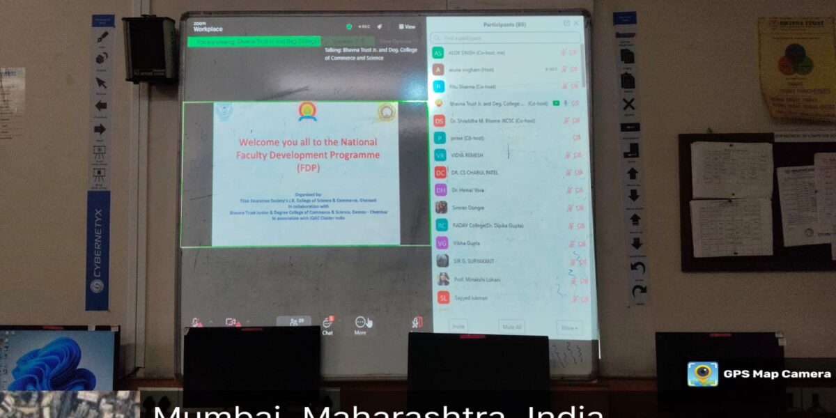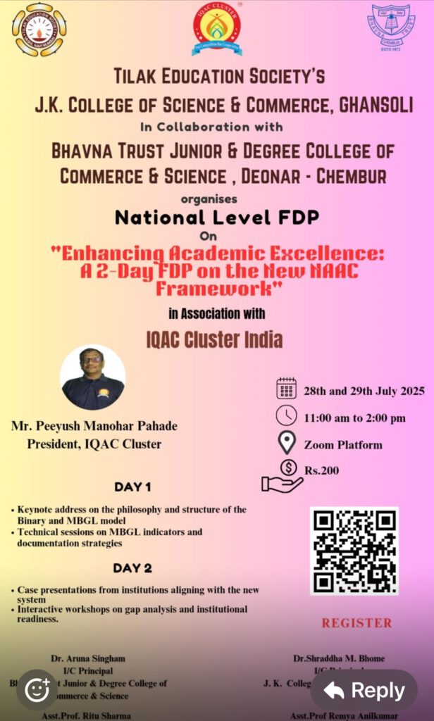 A two-day National Level Faculty Development Programme (FDP) titled “Enhancing Academic Excellence” was held on 28th and 29th July 2025 via Zoom. It was organized by IQAC Committee of Bhavna Trust Junior & Degree College, Deonar – Chembur, in collaboration with Tilak Education Society’s J.K. College of Science & Commerce, Ghansoli, and IQAC Cluster India.